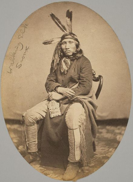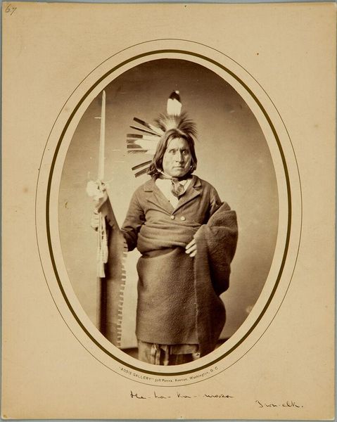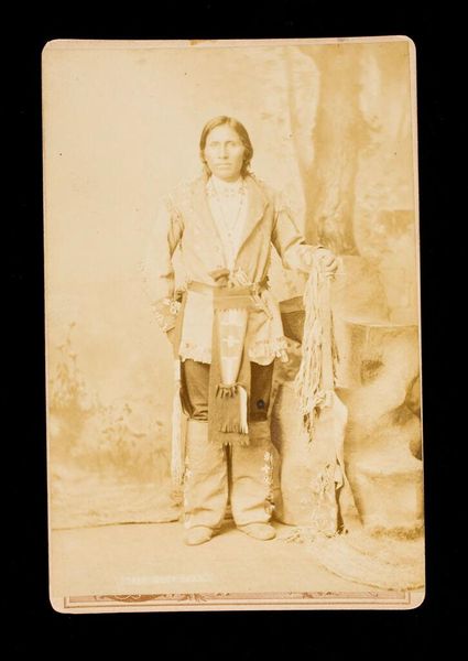 Curator: This image evokes such a complex blend of emotions. The subject is so young, yet he carries a weight that seems far beyond his years. There's an air of forced stoicism that immediately unsettles me. Editor: This gelatin-silver print, taken sometime between 1864 and 1904, is entitled "Portret van een jongen met pijl en boog in de hand", or "Portrait of a Boy with Bow and Arrow in Hand" and is credited to Eugène Pirou. What strikes you about its staging? Curator: The very construction of the scene seems calculated. Look at how self-conscious the boy looks as he holds the bow, not as a tool, but as a prop in the display. It speaks volumes about representation and the performance of identity forced upon Indigenous people at the time. We have to examine this photograph beyond just face value. Editor: Precisely. Photography, as it developed, served various agendas. Examining institutional and cultural forces helps to reveal those complexities. Curator: Absolutely. What narratives are perpetuated by choosing to portray this child in this way? Are we celebrating his heritage, or subtly reinforcing an image of the "noble savage?" And who benefits from these narratives? His vacant stare makes you think what this young person will feel if/when he sees himself depicted for consumption by outsiders? Editor: Consider the setting. A staged backdrop and props like those rocks undermine any sense of authenticity. It underscores the artifice inherent in image making and representation. Even the photographic print process—a colonial imposition, speaks to that complex intersection. It’s another layer, contributing to a deeper unease that is part of his heritage as we interpret it today. Curator: Right, because even a seemingly simple portrait contains so much historical baggage related to the photographer’s lens, colonial desires, and the subject’s experience. By discussing the politics behind his imagery and its continued circulation we might reclaim space for the actual lives it supposedly depicts. Editor: Agreed. Considering the power dynamics allows us to move toward critical viewing of art history, but even photography can promote ethical discussions of visual representation.