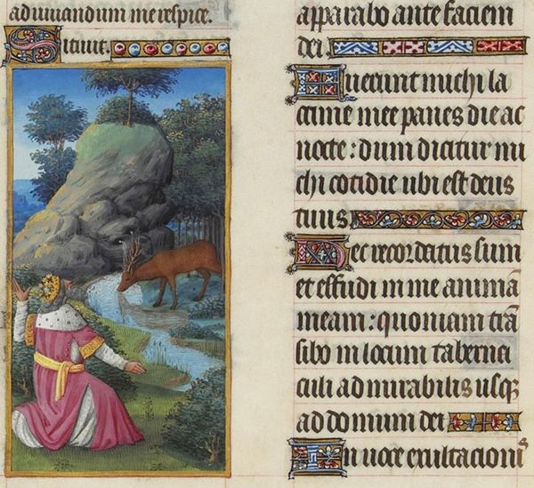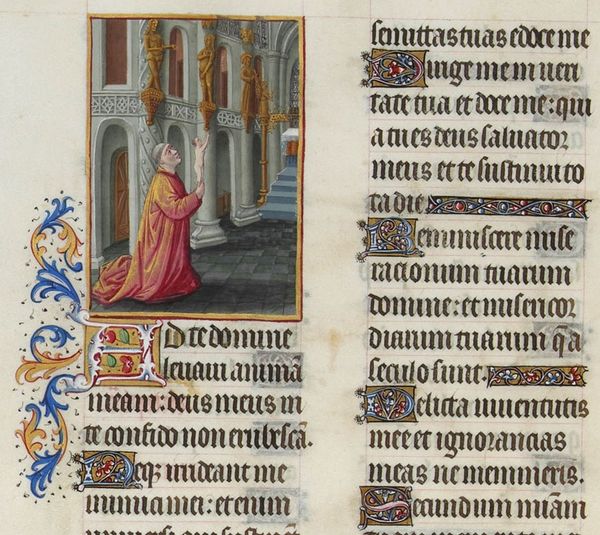 Editor: This illuminated manuscript page presents "Psalm XXVI," created by the Limbourg Brothers. It features both text and a vibrant miniature painting. The watercolor technique gives the image a soft, ethereal quality. I’m curious about how the artists integrated such different forms of media. What strikes you most about this work? Curator: Well, the materiality is really fascinating here. The labor involved in producing something like this—consider the preparation of vellum, the grinding of pigments, the meticulous hand-lettering and painting. Each element reveals a complex system of production. Editor: Production, interesting. It makes me think about the role of these illuminated manuscripts, as luxury objects, versus the actual religious content they portray. Curator: Exactly. These objects were meant to be viewed in very particular social contexts. Think about who would have commissioned such a piece, the resources they commanded, and what it symbolized. The gold leaf alone signifies not just wealth, but divine illumination. Editor: It is hard to imagine the sheer effort that went into this page. Considering the time invested and materials needed, this level of craftsmanship is truly remarkable. Curator: Absolutely. Examining the process helps us unpack not only artistic choices, but also the intricate relationships between labor, power, and spirituality in the late medieval world. Each careful stroke embodies a network of resources, skills, and beliefs. Editor: That really changes how I view the work. I was focused on the image itself, but understanding the production and materials tells a far more complete story.