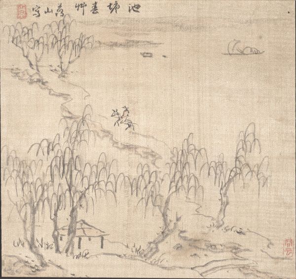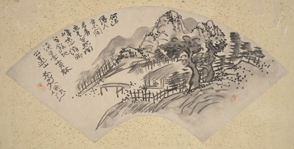 Curator: Kim Su-gyu's *Rainy Landscape*, created sometime between 1767 and 1799, employs ink and watercolor on paper. It resides here, at the Metropolitan Museum of Art. What's your immediate response? Editor: Gloomy. Atmospheric, yes, but a definite somberness. The almost monochrome palette emphasizes the starkness of the landscape. Curator: That melancholy feeling you pick up is key. The landscape tradition often acts as a mirror to the soul. Notice how the small figures are dwarfed by the mountains, emphasizing humanity’s fleeting existence compared to the timelessness of nature. Editor: Interesting, especially considering how nature here is rendered through such controlled, almost repetitive brushstrokes. Does that control suggest an attempt to manage or order this inherent vastness, almost to psychologically tame the landscape? Curator: Perhaps, though traditionally in East Asian thought, this harmony between man and nature doesn’t necessarily demand taming. The figures carrying what seem like covered burdens uphill – might suggest hardship, and acceptance. Rain itself is loaded with symbolism - sorrow, cleansing, renewal. Editor: The compositional structure supports that sense of arduous journey: my eye is pulled from the lower left corner with the human figures up and into the dense forest. The higher structures almost resemble an awaiting haven from the rain. Is there some kind of traditional journey archetype here? Curator: The journey, literally and metaphorically, is indeed central. Landscape painting often represents an inner quest or spiritual pilgrimage. It is interesting the lack of sky gives a kind of spiritual intimacy and urgency as we focus on the earthly plane. Editor: Yes. Without the sky, one almost feels trapped by the heaviness of earth and foliage. I noticed a small red signature, like a bold mark over the subtle ink and watercolour wash, is this the Artist's signature? Curator: Exactly! Its function is much more significant, acting not only as confirmation of the painting but also adds layers of aesthetic meanings. Red ink, as you know, in some instances is linked to concepts of prosperity and fortune. In contrast with the rest of the composition's sombre effect, it brings this sense of spiritual well-being into the artwork. Editor: Thank you, these different viewpoints allowed me to reconsider my initial thoughts, making it a lot more enriching and profound! Curator: A great and profound observation, the exploration of its symbolistic, formal construction adds richness, inviting repeated contemplations.