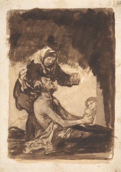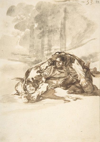 Curator: This ink drawing, created sometime between 1812 and 1820, is attributed to Francisco de Goya, and is titled "Revenge on Constable Lampiños." It looks intense. Editor: The first thing I notice is how the frenzied lines create such an immediate sense of chaotic energy. The earthy tones make it feel like the scene is unfolding right in front of you. It's claustrophobic! Curator: The physical act of drawing with ink lends itself well to portraying this sort of charged subject matter. Look how the dense, dark strokes build form, creating deep shadows and compressing the figures within the composition. The rapid execution almost becomes performative. Editor: Absolutely! You can almost feel Goya’s own agitated state as he created it. This wasn’t leisurely studio work, more like a feverish outpouring. And it speaks volumes about the socio-political unrest of the time, doesn't it? Curator: Without a doubt. Consider the title itself. "Revenge." We’re seeing a representation of popular justice enacted upon an officer, suggesting a deep distrust of authority and legal systems during that era. The labor, here, is of both artistic creation and vigilante retribution. Editor: I see it too. What I get from it is a primal scream— the pain of injustice, rendered visible. In fact, thinking about injustice makes me ponder the use of brown ink...It could suggest how all these bodies melt into one another, making it hard to spot the real 'wrongdoer', in what would certainly have been considered an act of anarchy. What I read, through his work, is that the 'people' take collective action against authorities that abuse their power... Curator: It’s a fascinating detail— the relative disposability of the medium underscoring the urgent political context. Goya frequently subverted the perceived value of art, choosing inexpensive materials for profound statements. Editor: Agreed. A visceral response made permanent with just ink and paper... something almost ephemeral but terrifying nonetheless. Curator: Yes. When you reflect upon all the circumstances around it, from process to production to theme, the drawing certainly stands as a formidable act of resistance. Editor: Exactly. It makes me rethink how seemingly humble artistic materials can convey tremendous power. It still resonates strongly.