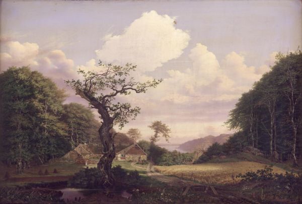 Curator: Here we have "Summer Twilight," an 1827 oil painting by Thomas Cole, held in a private collection. It exemplifies the Hudson River School's fascination with the American landscape. Editor: It's dreamy, isn't it? The light is incredibly soft, almost like looking at a stage set, everything bathed in this gentle luminescence. Curator: Cole’s use of plein-air studies allowed him to capture that very specific quality of light. The way he positions the waterfall on the left, with that group of animals drinking, and then opens the vista up toward the distance... it's about creating a narrative of harmony. A narrative deeply intertwined with America’s burgeoning national identity and relationship to nature. Editor: And a narrative of control. It looks romantic, but the landscape is almost too composed, neatly framing that central vista. Look at the work in the trees, and you start seeing the manipulation. The carefully placed rocks… the picturesque, almost story-book quality. What were the socio-economic pressures that asked for nature to be “tamed” on a canvas? Curator: Indeed. While Cole celebrated the sublime wilderness, his work often subtly promoted an arcadian ideal, erasing signs of Indigenous presence and glossing over the environmental impact of expansion. He grapples with the very real tension between untouched nature and the march of civilization, but ultimately sides with the narrative of progress and potential that defined the American project. Editor: Look closely at that tiny white structure, like a miniature version of Tara, on the middle distance's right-hand side. And if it's there, other structures—mills? churches?—would also have relied on this land's resources to be built, not the other way around. It's almost as if he knows that this “sublime wilderness” won't stay that way for very long. Curator: Absolutely. By understanding the ideological frameworks shaping Cole’s vision, we can unpack how notions of wilderness and national identity were – and are – actively constructed. His painting opens up vital conversations about our own responsibility in perpetuating myths of exceptionalism or forging a more just relationship with the land and its people. Editor: It makes you wonder about the paint itself, where did his pigments come from? What resources were extracted to create the pigments he employed to immortalize that perfect scenery? Everything, in the end, stems from somewhere. I'll never look at an idyllic painting without thinking about these things from now on. Curator: Indeed. Cole's "Summer Twilight" speaks to our complex relationship with the past.