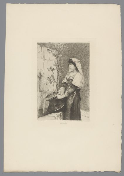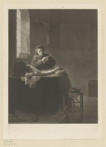 Curator: Standing before us is "Vrouw met kind aanbidt in een kerk schilderij van Maria met kind" a work created with ink on paper, sometime between 1830 and 1851, and attributed to Adolphe Mouilleron. What are your first thoughts? Editor: Intimate and somber. It has this shadowy, almost dreamlike quality... like peering into someone's memory. Curator: It certainly does evoke a mood. Given the Romantic style tag, I'm particularly drawn to the artist's portrayal of emotion, this yearning. Mouilleron captures a mother and child kneeling in what appears to be a church, gazing upward at an image of Mary and the infant Jesus. What is compelling about it, to you? Editor: Beyond the explicit religious theme, it also evokes that complex relationship between motherhood, devotion, and institutional power. Who has access to what divinity and at what cost? The kneeling mother, in her seeming vulnerability, poses interesting questions about female agency. Curator: The drawing style itself, though delicate, hints at a kind of architectural constraint too. You can sense the weight and solidity of the building, that even divinity seems contained. Editor: Right. And it makes me think about the history of who gets to represent whom, who has a voice. While the madonna and child occupy that visible, framed position, it's crucial that we question those visual economies and the often hidden figures, like this mother, that support them. Curator: It’s fascinating how a seemingly simple devotional image can open up so many avenues of inquiry. It really does feel like there’s both reverence and subtle tension in play here, a blend of inner spirituality and social awareness. Editor: Indeed, this piece beautifully illuminates how faith, art, and power become intertwined, creating space to see familiar themes with a critical eye, recognizing both devotion and those complex forces constantly shaping how it is shown to the world.