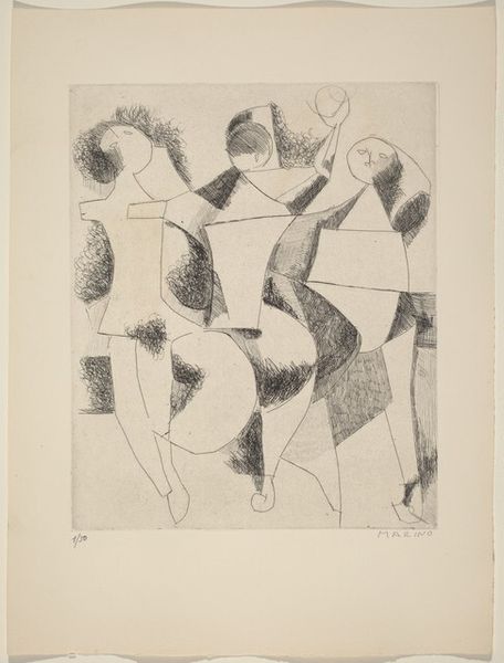 Curator: Let's discuss this piece by José M. Pavón titled "Noon Hour," created in 1932. Editor: There's a profound stillness to it, almost like time is suspended. The stark contrasts in light and shadow really create a sense of anticipation, but of what? Curator: I think understanding the print medium provides a starting point. Consider the labor required to create such detailed gradations with what appears to be a very simple palette. This would involve considerable control over tools and physical effort by the artist. Editor: Absolutely. I immediately see the subjects' somber disposition in light of Mexican Muralism which had a socio-political stance. Knowing the era, doesn’t this portrayal become a social commentary? The common people, seemingly at rest, perhaps workers taking a break, rendered with such stark realism...it hints at something deeper than just a tranquil scene. Curator: I agree that Pavón seems interested in social realism. If we examine Mexican Muralism, it clearly had the means to convey its intended messages using fresco or other similar painting processes which involved working collectively with assistants. Pavón seems to favor printmaking, suggesting that the piece was created in a studio or other context in which he was acting primarily alone. Editor: Still, there is something haunting in the rendering of their faces. The anonymity created by the shadow serves to represent the countless unseen, unheard laborers of the time. Perhaps they’re taking shelter from the harsh sun, both literally and metaphorically, escaping the social realities even just for a moment. I’m looking at their clothing and wondering whether or not a modern viewer could perceive the uniformity as representative of their being cogs in a much bigger, oppressive, machine? Curator: That's a perceptive reading, though I lean towards acknowledging how materials—particularly the cost and availability of certain media—affect artistic choice and reception. This is evident even in contemporary installation. The choices the artist has to make often shape our response to any particular art piece. Editor: A good point. Seeing art this way certainly gives pause to considering its impact beyond surface aesthetics. Curator: Agreed. It allows us to reconsider what art is capable of expressing under certain material conditions and the means to deliver such expression.