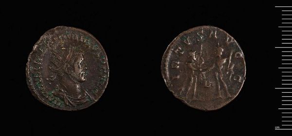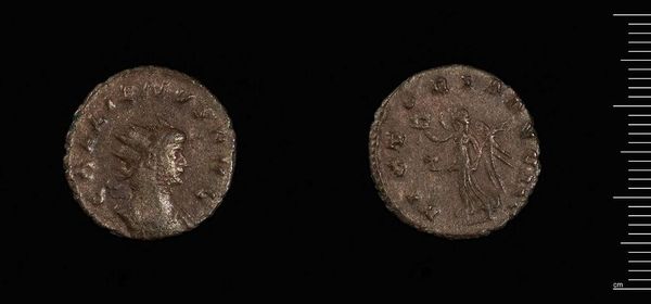 Curator: Here we have an Antoninianus of Numerian, struck in Rome during his brief reign. What grabs you first about this humble coin? Editor: Immediately, I see power and authority represented through symbolic imagery, even in this worn state. The figure on the reverse… is that Victory? Curator: Quite possibly! But let's consider the coin's function. It’s a Roman denomination valued for its silver content. Its production and distribution were tightly controlled by the state. Editor: Yes, and the image of Victory reinforces Roman imperial ideology. Numerian's portrait embodies traits deemed desirable in a leader—strength, wisdom, military prowess, all packaged into a portable, reproducible form. Curator: The coin speaks volumes about labor, extraction, and the Roman economy. It is not just art, but infrastructure. Editor: Indeed, a fascinating convergence of propaganda and practicality. Curator: I’ll remember that the next time I reach into my pocket.