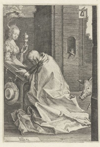Albrecht Altdorfer created this engraving, titled "Praying Cleric Before Mary and Child", sometime in the early 16th century. The image reflects the religious and social hierarchies of the time. Mary, as the mother of Jesus, sits enthroned, holding her child. Her serene and detached expression contrasts with the cleric kneeling before her. This juxtaposition underscores the divine status of Mary and Jesus in relation to earthly supplicants, as well as the power of the church. The cleric’s act of kneeling symbolizes humility and reverence, reinforcing the societal expectation of deference to religious authority. In the background, a battle rages, a reminder of the ever-present conflicts of the era. Altdorfer masterfully uses the detailed background to suggest the broader social and political contexts that permeate even the most intimate and spiritual moments. The image serves as a reminder of the intricate dance between faith, power, and the human condition during a period of religious and social upheaval.