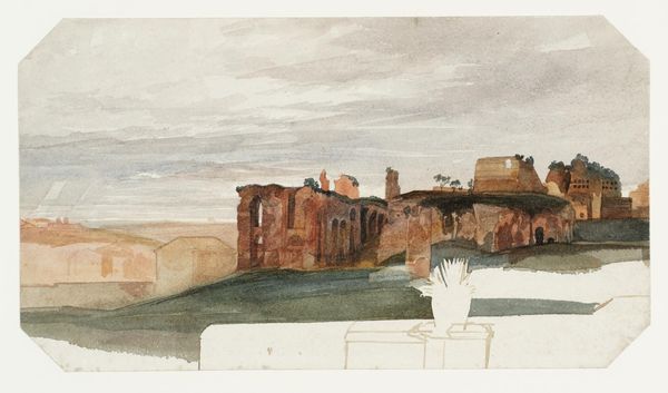 Curator: This delicate watercolor depicts Canonbury House in Islington, created by Cornelius Varley sometime in the early 19th century. Editor: It has a melancholic air, doesn't it? The muted palette evokes a sense of bygone days, like a fading memory. Curator: Varley’s application of pigment is quite strategic. Observe how the architectural forms are defined by subtle gradations of tone, lending them volume and depth. Editor: The tower, in particular, seems to stand as a symbol of resilience, even in the face of encroaching urban development. There's a touch of defiance in its silhouette. Curator: Indeed. The composition is arranged to emphasize the geometry of the building and its relationship to the surrounding space. Notice the rhythm of the rooftops against the sky. Editor: I find myself pondering on the people who inhabited these spaces, their hopes and dreams reflected in these stones. Curator: A thoughtful observation, and one that leads to new layers of interpretation of the work. Editor: Absolutely, it's always a joy to connect with the past through art.
