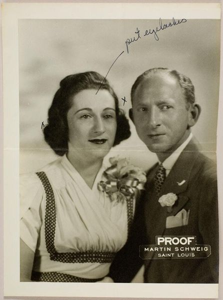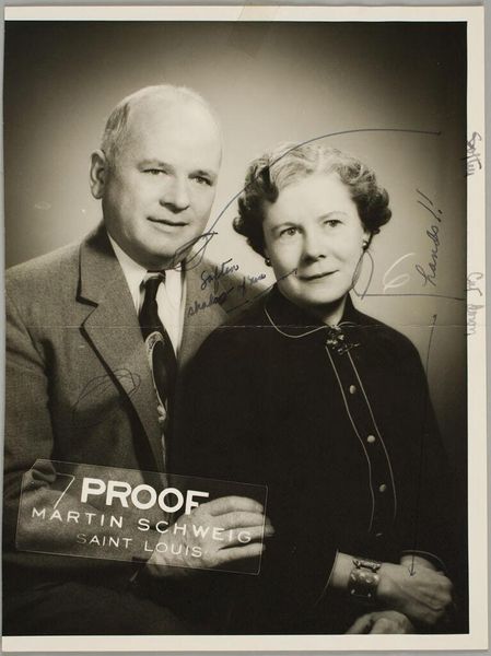 Curator: This is an untitled studio portrait by Martin Schweig, showing a man and woman, captured in a silver gelatin print. I find it quite haunting, almost spectral. Editor: Haunting, yes. It's the process, really. The silver gelatin gives it that ghostly pallor, and look, you can see "PROOF" stamped on the bottom, evidence of a commercial process. Curator: But look at her corsage, its placement almost a shield, protecting her. Corsages often represented affection, courtship, a social code. Editor: And her dress, cinched at the waist…consider the labor in its making, the fabrics available, the consumer culture it reflects. That belt, too, studded for effect. Curator: There's a strange disquiet. The woman's mouth looks to be altered with stitches, creating a disturbing, unsettling feeling about the image. Editor: Disturbing, certainly. These small-scale objects reveal the social dynamics around production, documentation, and access to goods. Curator: The symbols and context swirling around this piece present a complex narrative. Editor: Indeed. Even this photographic memento reveals the intersection of labor, class, and representation in the everyday.