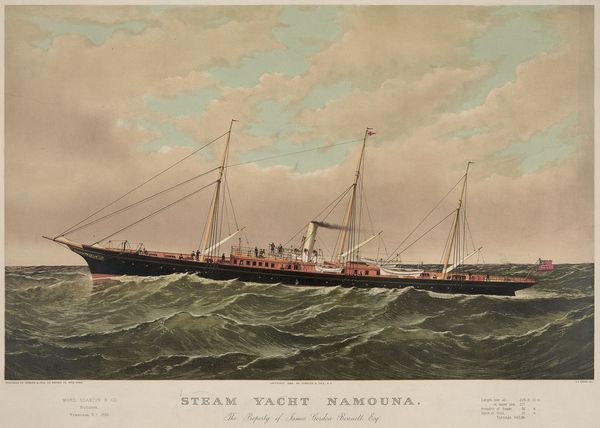 Curator: Here we have an 1883 watercolor print from Currier and Ives entitled, "Penobscot, New England coastal steamship". It depicts the steamer Penobscot cutting its way through some pretty dramatic waves. What strikes you initially? Editor: That enormous paddle wheel, for starters! It dominates the scene, an intricate and almost delicate mechanism powering this beast of a steamship. There's a fascinating tension between the industrial and the picturesque at play here, don’t you think? The billowing smoke, too. You can almost smell the coal burning. Curator: Precisely. Currier and Ives were masters at romanticizing industry and westward expansion. While trained as fine artists they moved into a more lucrative space, bringing art to a broader middle class audience. They transformed these symbols of industrial might into something almost aspirational, imbued with a sense of adventure and progress, selling the dream more than the grit, let's say. Editor: Well, looking closely at those waves, one can tell this isn't simply a neutral record of maritime transportation. There’s certainly artistry there. The swells feel quite exaggerated, contributing to a real sense of motion and perhaps even peril. Consider also the material context, printmaking democratizing images to an audience keen to celebrate progress, making industry consumable at a domestic scale. Who made this print exactly, do we know? Curator: The names "Currier and Ives" signify a collaborative brand more than the hands of particular artists in this era. Though many different artists were employed to make artworks under these names, the focus was very much on consistency and ease of mass production, prioritizing market demands over specific artistic voices. Editor: A very good point. And in their time, I'm sure their works served as functional decorations, inexpensive glimpses into a larger world for a nation undergoing immense change. It seems so removed from how we understand or engage with such prints now. It asks us what we do with industry today in this digital production world. Curator: It does, indeed. It highlights that fascinating tension between the machine-made and the handcrafted. It allows us to appreciate how art continually redefines its relationship to production. I've rather changed my thinking about this piece... Editor: Me too. I began purely captivated by this maritime titan, but it becomes increasingly unsettling to view the painting just as it is, especially when understanding how many individual processes it took to get here.