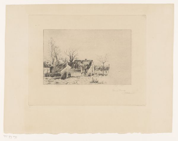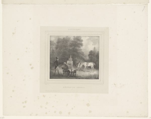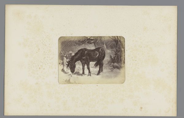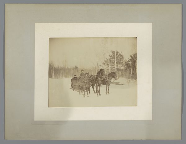 Curator: What strikes me immediately about this photograph is the almost overwhelming whiteness, a study in muted tones. Editor: It certainly feels like the very chill of the St. Lawrence River has been captured, nearly frozen, onto the photographic paper. This photograph by Alexander Henderson is titled "IJs kruien op de rivier St. Lawrence, Montréal, Canada" and was likely taken sometime between 1870 and 1910. Curator: Note how the stark horizontal lines—the distant tree line, the low horizon, even the dragged timber—emphasize the seemingly endless expanse. It directs the gaze across this flattened pictorial space, making one aware of its careful pictorial arrangement and pictorialist sensibilities. Editor: Yes, one can really sense the arduous labor in this scene. The visual economy gives prominence to the toil—the extraction of lumber perhaps, made difficult by the deep snow. Consider the labor involved in the whole process; from felling of the trees and then moving heavy logs using horse power in this snowy terrain, down to Henderson’s physical and chemical processes. Curator: Observe how Henderson uses selective focus. The foreground elements—the horse and the figures—possess a softer quality, differentiating it from the background. It’s more concerned with eliciting an atmospheric effect than precise realism. Editor: It does invite questions of what materials were accessible and under what environmental conditions were these types of landscape scenes even produced? What constraints and challenges did the photographic material place on representing snowy whiteness so prevalent here? Curator: Precisely, materiality provides a very different insight into this piece that goes beyond technique, symbolism or mere emotional effect. Editor: Indeed, looking through materiality as the frame for visual experiences such as this one has broadened my understanding of landscape photography. Curator: And considering the formal arrangements certainly enhanced my understanding of how the experience of Canadian landscapes are encoded in these images.
