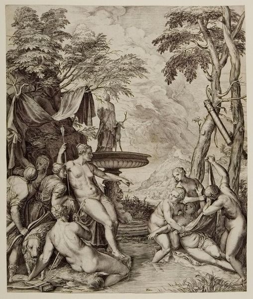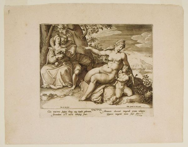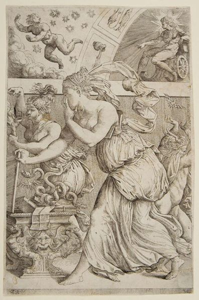 Editor: This is "Venus and Cupid" by Agostino Veneziano. It's a print, quite small actually. The sharp contrast makes it quite striking. What's your take on it? Curator: This print is interesting when viewed through its production. Look at the fine lines. The labor! It reflects the rise of printmaking as a form of art accessible to a wider audience, and the commercialization of classical themes. Editor: Commercialization? That's a bit cynical, isn't it? Curator: Not at all! It’s about the material conditions of art. The reproductive nature of printmaking democratizes images, affecting consumption and artistic value. What was originally for the elite is now available to the masses. Editor: I see! I hadn't considered the social impact of printmaking itself. Thanks!