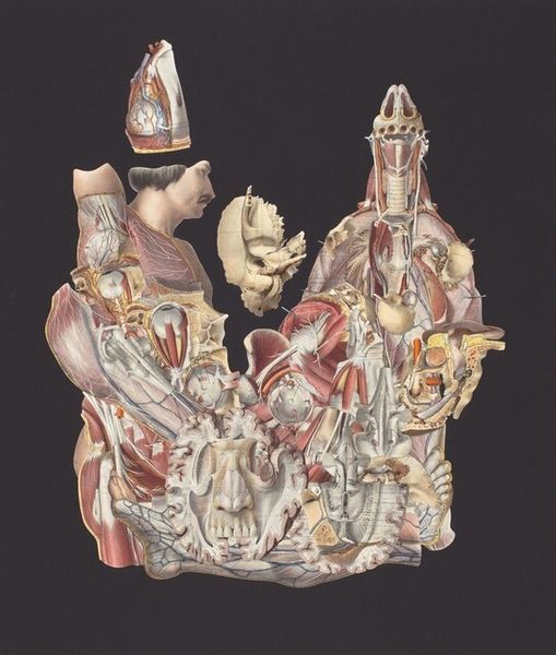 Editor: Here we have Tadanori Yokoo’s mixed-media collage "Greeting," created in 1972. The composition feels quite surreal, almost dreamlike with its juxtaposition of religious iconography and earthly elements. How do you interpret this work? Curator: This piece strikes me as a powerful commentary on cultural hybridity and the commodification of spirituality. The floating figures resembling Christ allude to Western religious influences, yet their placement within a collage featuring what looks like Japanese foot charts destabilizes any singular interpretation. Consider the context: Japan in the early '70s was experiencing rapid Westernization alongside a resurgence of interest in traditional spiritual practices. Do you think Yokoo might be addressing the tension between these forces? Editor: That’s a really interesting point. The inclusion of those foot charts now seems to point toward Eastern philosophies, juxtaposed with what looks like a Renaissance nude and other more Western symbols. So, you are seeing it as Yokoo responding to the cultural landscape of the time? Curator: Precisely. Yokoo, like many artists of his generation, was grappling with Japan's complex relationship with the West. This collage, with its disparate elements and its deliberate, almost jarring juxtapositions, embodies that struggle. The “Greeting” in the title becomes ironic; it's not a harmonious welcome, but a confrontation. How do the materials – the medium of collage – contribute to this idea? Editor: I see what you mean. Collage, by its very nature, is about bringing together different fragments, different viewpoints. So, the medium itself reinforces the message of cultural tension and hybridity. It definitely provides more depth than I initially understood! Curator: Exactly! And understanding that historical and cultural context helps unlock new meanings. It shows that art can reflect those contemporary social landscapes. Editor: This conversation has helped me realize how essential it is to consider the cultural background of the artwork to discover what it may express. Curator: Agreed! And by considering cultural contexts, we are better able to consider an artwork's resonance within our own contemporary landscapes.