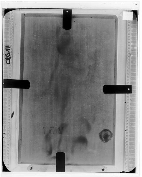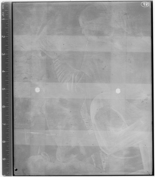 Curator: What an unusual image to contemplate; it’s an X-radiograph of the "Pieta," after Marco Basaiti. The starkness is almost unnerving. Editor: Indeed. The grayscale tonality seems to strip away the layers of sentimentality usually associated with the Pieta theme, leaving only the essential form. Curator: Quite so, the skeletal structure appears to emphasize mortality, while the composition is radically flattened. Editor: It’s fascinating how this radiographic perspective changes our understanding of the original artwork’s reception and what it signifies within a religious and cultural context. The layers of paint and canvas become irrelevant. Curator: A study in pure form, then. Editor: Precisely. It compels a re-evaluation of artistic expression and challenges the conventional interpretation of art history.