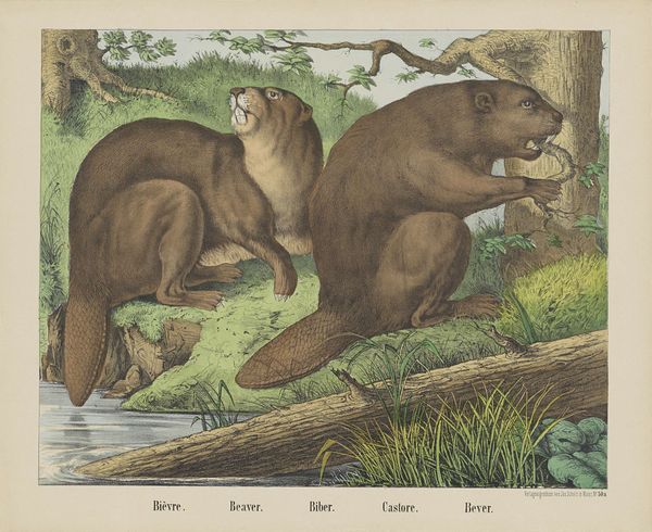 Curator: This is "Black Bear, from the Quadrupeds series" created around 1890. It’s a drawing and print made by Allen & Ginter for their cigarette cards. Quite an interesting choice of subject matter! Editor: It is a rather intense scene. The immediate focus is on the raw flesh the bear is consuming, contrasting with the more subdued backdrop. It's quite striking for such a small print. Curator: Absolutely. Consider the context: these cards were collected and traded, predominantly by men. The bear as a symbol is tied to raw power and wilderness. Allen & Ginter were capitalizing on these notions, reinforcing ideas about masculinity and dominance that resonated with their consumer base. The ideal of men needing to demonstrate these abilities when they went West. Editor: True, and in that line, observe how the texture has been achieved in the fur. There's an attention to detail that elevates it beyond a mere promotional image, don't you think? See the contrast of color to suggest form! Curator: Definitely. This image plays into a much larger narrative of frontier expansion and the taming of nature, prevalent in American ideology. The image taps into this myth, suggesting humans overcoming such forces is not always possible but a nice thought to push in propaganda. Editor: Yes, but beyond this imagery it stands alone with form that invites a prolonged look. There's the weight of the bear, grounded. But the limited tonal range almost flattens the picture plane. It has depth but fights the depth that it is so strongly presenting. Curator: A flattening that further reduces it to its intended, manipulative message as a status symbol within a certain social hierarchy. It’s fascinating how so much cultural meaning can be packed into something so small and seemingly innocuous. It encourages us to explore larger themes like civilization versus the wild. Editor: Exactly, the success is on how this narrative coexists within an attractive image. Curator: These things have such lasting echoes.