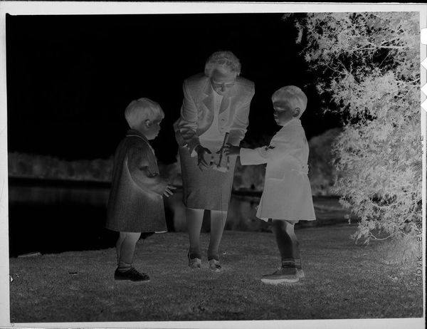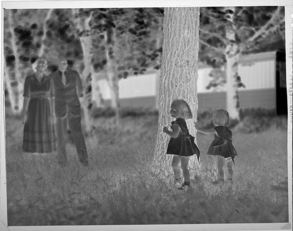 Editor: So, this is an Untitled photograph by Lucian and Mary Brown, showing children at a party, and it has a kind of eerie, dreamlike quality. What do you see in this piece? Curator: It feels like a memory, doesn't it? Distant, a little blurred, but full of potent feeling. The negative image flips our expectations; it's like seeing the ghost of childhood games. It makes me wonder what they were playing. Editor: It definitely brings up that feeling of nostalgia! I hadn't really considered how the inverted tones intensify the emotional impact. Curator: Precisely. It’s about evoking a sense of something just out of reach, the bittersweetness of remembering. And maybe also the strangeness of childhood itself. Editor: This has really encouraged me to think about photography not just as documentation, but as a medium for exploring memory and emotion. Thanks! Curator: My pleasure. It's a reminder that art is everywhere, even in the most humble snapshots.