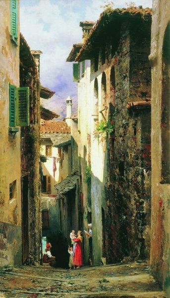 Editor: So, this is "Ronda, Spain" by Denman Waldo Ross. It's a small, dreamy painting of a Spanish street. It feels kind of... lost in time, you know? What do you see in this piece? Curator: Lost, yes, I feel that too! It’s the dissolving architecture, isn’t it? As if the buildings are exhaling into the light. Ross is letting us peek into a memory, blurred but beautiful. It’s less about architectural precision and more about the feeling of being there, wouldn’t you say? Editor: Absolutely! It's more impression than reality. It makes you wonder what it was like to stand there. Curator: Exactly! And that's the magic. Ross invites us not just to look, but to remember alongside him. Editor: That's a great point, it's like a shared memory, somehow.