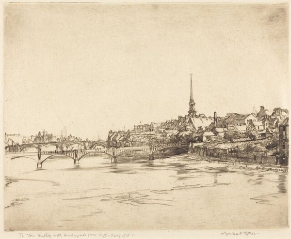 Editor: This print has such a wonderfully light and airy quality. There’s a sense of quiet industry here. Curator: Indeed. What we’re looking at is “Rockport,” an etching created by Ernest D. Roth in 1918. The realism evokes the essence of this coastal town through its intricate details. The composition seems meticulously balanced. Editor: The texture created by the etching process is quite evocative. The linear marks generate not just shape but also tone. Thinking about the artist and the material—the metal plate, the acid, the press, it reveals a specific, deliberate kind of labor. Curator: Precisely. Notice how Roth employs line and light to articulate form. The delicate hatching and cross-hatching define the architectural structures and reflect light. He has really mastered tonal values. It shows that mastery and control of materials is itself a signifier of quality, within the structure of fine art. Editor: Do you think the focus on realism, so exact in its representation, in a way obscures the true labor involved? To depict this scene required access to particular spaces, social structures, and materials like paper and ink which weren’t widely accessible during that period. Curator: That's a very interesting point. While the print depicts a specific place with realistic clarity, you make me think about the socio-economic dynamics at play behind the scenes that underpin Roth’s ability to create it in the first place. Editor: Yes. By observing how an artwork is physically constructed we gain deeper insight into how culture operates in relationship to its physical and societal conditions. Curator: Absolutely. The linear framework of etching has produced a rather intriguing aesthetic experience which opens into various levels of theoretical contemplation, a dance between intention and the tools themselves. Editor: This image of the port has now given me many points for further material exploration into a particular space and time. Curator: Well, the conversation on how aesthetic and material explorations mutually build onto another now seems set to continue far beyond this short visit.