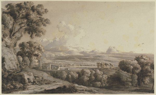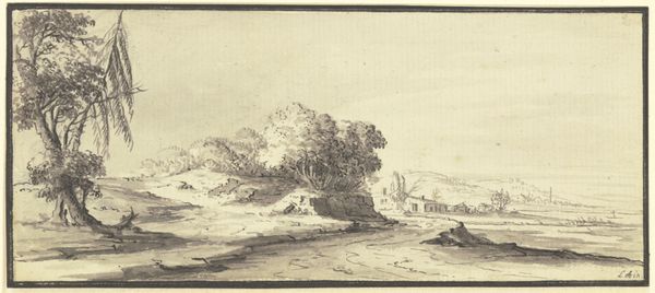 Rembrandt’s landscape drawings are basically always sketches drawn before the motif. The kind of finished composition we find here, with tiny people in a majestic “world landscape” of mountains, a river, city and countryside is found in only a few of his paintings. This and the signature, unusual in his drawings, led to the suspicion as far back as the 19th century that this print was a “forgery”. More recent examinations however have produced arguments favouring the notion that it could in fact be an original. A close look at the range of details, simply drawn but vibrant, such as the travellers in the left foreground, reveals a level of drawing expertise not anticipated in a first glance at this surprising drawing.