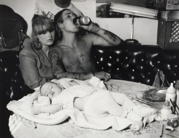 Curator: I feel a little voyeuristic looking at this photograph. There's an immediacy to it, an "I was there" sensation... sort of buzzing. Editor: It's that raw social-realism vibe, isn't it? This is Garry Winogrand's "Centennial Ball, Metropolitan Museum, New York" captured in 1969, using a gelatin silver print. Tell me about that buzz! Curator: Well, first there's the sheer material pleasure of the textures, contrasting the Klimt-like wallpaper, with the geometric print of the dress. The composition itself has an air of…snapshot happenstance? The people, caught mid-sway, feel incredibly alive. Editor: Exactly! And consider the historical context. The Met, that grand institution, celebrating its centennial amidst the swirling cultural shifts of the late '60s. I see it through the labor involved, too. Think of producing gelatin silver prints versus digital: the hands-on darkroom processes are a very specific kind of craft-making. Curator: Yes! One thinks, who were these anonymous celebrants? Were they aware of being caught on film for posterity, their revelry imprinted on silver? There is something very playful and ironic happening, as it feels somehow anti-monumental, a cheeky jab at the centenary celebration. Editor: Cheeky and aware, certainly. Winogrand wasn't simply documenting. He was engaging critically with ideas of social performance, materiality and privilege. I also see a subtle comment on accessibility, or rather, inaccessibility, to "high culture", revealed by how its elite celebrate itself using styles pilfered from a modernist art icon. Curator: Do you ever wonder about the lives behind these captured moments? Like, that woman in the geometrically patterned dress-- where is she now? There is also the man behind, with a sly grin on his face! So many different human energies caught within this frame. Editor: Yes! But as a piece of art, a manufactured object from base elements, one can examine it now like a piece of archeology, and understand this artifact through its methods of production. The dance frozen, processed in a darkroom. The means matter! Curator: Yes, frozen and rendered as dreamlike echo, a moment shimmering for all eternity. So what's left to say after that? Editor: Simply this, material matters meet minds. A wonderful encapsulation of Winogrand's artistic vision.
