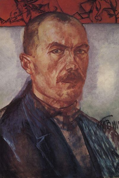 Kuzma Petrov-Vodkin created this self-portrait using oil paint on canvas. Oil paint is made by combining ground pigments with drying oil. The viscosity allows the artist to blend colors seamlessly and create the smooth tonal gradations visible here, while building up a textured surface through repeated applications of paint. Petrov-Vodkin coaxes a wide range of subtle tones and depth from the simple application of oil on canvas. We can consider this painting as not only a representation of the artist's likeness but also a product of his labor. The countless hours spent mixing paints, preparing the canvas, and meticulously applying brushstrokes, transform humble raw materials into a window into his soul. The very act of painting becomes a testament to Petrov-Vodkin’s skill and dedication. Paying attention to the materials, processes, and social context allows us to appreciate the full meaning of an artwork, blurring the traditional distinction between art and craft.