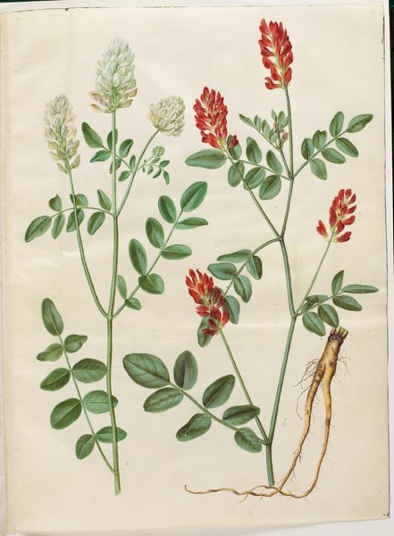 Hans Simon Holtzbecker made this botanical illustration of Lathyrus in the 17th century, using watercolor on paper. The artist uses delicate brushwork to depict the subtle gradations of color in the flowers and leaves, and this reflects a keen eye and a steady hand. Note the exacting detail: Holtzbecker has rendered every vein and tendril with remarkable accuracy. This level of precision demanded significant time and skill, aligning the artwork with a tradition of scientific illustration, where faithful representation was paramount. But the artistry here is not just technical. The composition shows an interest in both botanical accuracy and aesthetic appeal, elevating the work beyond mere documentation. Holtzbecker has arranged the plants in a way that is both informative and visually pleasing. Ultimately, this artwork reminds us that even the most seemingly objective depictions are shaped by human intention and skill. It challenges us to appreciate the artistry inherent in craft, and to recognize the value of work that combines meticulous technique with aesthetic sensibility.