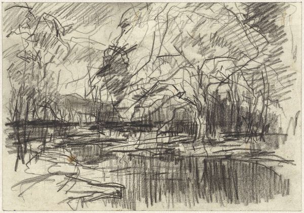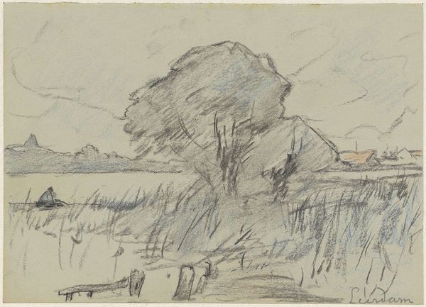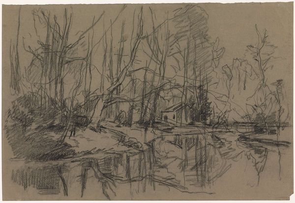 Anton Mauve rendered this landscape as a quick study in charcoal, likely en plein air. The inherent qualities of the charcoal – its dryness and tendency to smudge – allowed Mauve to capture the fleeting effects of light and atmosphere. Consider the physicality of the marks: rapid, gestural lines building up the composition. You can imagine him holding the charcoal stick loosely, moving his hand freely across the paper. The soft, grainy texture of the charcoal lends itself well to depicting the rough textures of the landscape. Mauve skillfully employs shading to suggest depth and volume, building up darker areas to create a sense of three-dimensionality. This sketch is not about refined, polished form; it is more about capturing the essence of a scene. The directness and immediacy of charcoal perfectly suited Mauve's intention, collapsing any assumed hierarchy between sketching and finished painting. We can appreciate the importance of materials and making in understanding the full meaning of this artwork.