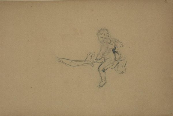 Curator: This captivating sketch is titled "Monsterlijke heks op een bezem", or "Monstrous Witch on a Broom," by Cornelis Saftleven. It was rendered sometime between 1617 and 1681. Editor: Intriguing! It feels unsettling and otherworldly. The delicate lines give it an ephemeral quality, as if this creature might vanish at any moment. The grayscale palette contributes to the sense of unease, emphasizing the starkness of the figure against the bare paper. Curator: Indeed. Saftleven employed pencil, pen, and ink on toned paper, an interesting combination of readily available materials. I see this piece within the context of the rising print culture and fascination with the occult during the period. Consider the widespread anxieties surrounding witchcraft; this drawing could reflect, and perhaps even reinforce, prevailing superstitions about labor, gender and marginalization in a rapidly changing society. Editor: The tonal variations are quite compelling, aren’t they? Notice how the artist models form with subtle gradations, creating depth and volume, particularly around the figure’s torso and legs. And consider the composition – the dynamic diagonal of the broom bisects the space, drawing our eye from the witch's grotesque face all the way along the trajectory of her flight. The artist balances detailed work like the rendering of the hands and feet with open negative space that seems charged with some undefined magic. Curator: I'm also drawn to the seeming contradiction in this piece. Saftleven presents a grotesque, monstrous figure, yet uses very accessible media. Was it created as a finished piece? Or more likely an expressive, perhaps subversive, exercise? What commentary might he be making on laboring class and the access to the print trade? Editor: The lines are economical yet evocative, and contribute a certain graphic power. What do you make of the wings? They feel somewhat vestigial. Curator: Perhaps symbolic? These types of wings seem to carry clear markers for both humanistic and diabolical symbolism from the time. Editor: Regardless, it all amounts to a small but visually arresting composition that uses form to create powerful emotive impact, reflecting both the inner demons and fears of a period and place. Curator: Yes, it invites us to reflect on both the artist’s and the broader culture's understanding and depictions of so called 'monstrous' beings within the economic conditions of his day. It leaves me wondering about the lived experience and beliefs about magical labour within Saftleven's cultural moment.