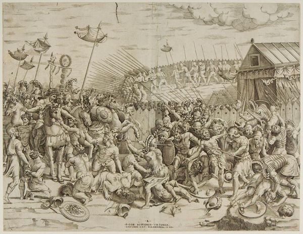 Curator: This compelling engraving depicts a grisly historical event, the death of the De Witt brothers. Its attributed to Romeyn de Hooghe and was made between 1672 and 1675. Editor: It’s chaos. I’m immediately struck by the density of figures, all rendered in incredibly fine detail. The texture is overwhelming, almost like a visual scream. It's clearly intended to shock. Curator: Absolutely. It's important to remember the socio-political context. The De Witt brothers, key figures in the Dutch Republic, were lynched by a mob amidst political turmoil. De Hooghe's image wasn't just a depiction; it was a political statement, fueling existing sentiments of that period. Prints like this were readily reproducible, allowing for dissemination of these ideas. Editor: So, thinking about that dissemination… the lines feel deliberately harsh, almost like a woodcut, but we're dealing with an engraving. I am curious about the choice of the material; it gives a sense of raw immediacy, despite the intricacy of the design. Is it commenting on the perceived "coarseness" of the mob and therefore perhaps a criticism? Curator: That's an insightful interpretation. Engravings, especially prints like these, held a powerful position. They were mass-produced. But its craftsmanship offered authority at the same time. It's a balancing act: between affordability for broad distribution and visual precision to persuade public sentiment. Note how the bodies of the De Witts are prominently displayed in the center of the scene, elevated upon what appears to be some kind of platform, becoming a spectacle for all to witness. Editor: That placement makes the brothers the ultimate commodity here, laid bare for public consumption. It draws us, as viewers, into that consumption. The materiality then… it forces the viewer to reckon with not only what happened but also the uncomfortable nature of observation, doesn’t it? Is it art or propaganda? Curator: Indeed. De Hooghe blurs those boundaries, leveraging both the artistic skill and the accessibility of printmaking to shape the narrative. And that's why this artwork, although depicting an awful moment in Dutch history, is also such a valuable piece to study within our collection today. Editor: It is an effective marriage between artistry, material availability, and public outcry, isn't it? It serves as a potent reminder of the power of art to not just document history, but also actively shape it.