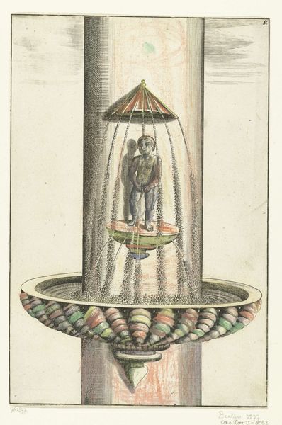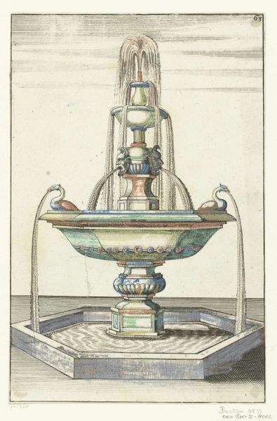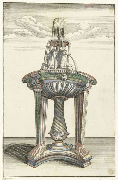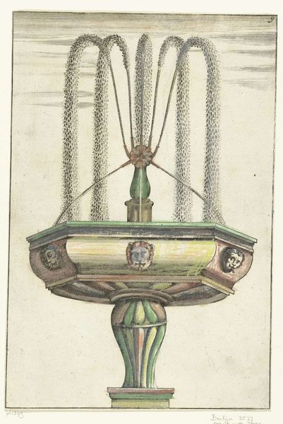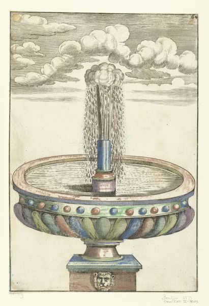 This anonymous print depicts a fountain with four lobes. Water, the lifeblood of civilization, gushes upwards, recalling the life-giving power of ancient river gods. Consider how the fountain motif has flowed through art history, from the elaborate displays of power in Versailles to the simple, meditative fountains of ancient Roman courtyards. The upward surge of water, often associated with spiritual purification and renewal, echoes the “Urpflanze,” the archetypal plant form that Goethe envisioned as the source of all botanical diversity. The fountain, therefore, becomes a symbol of continuous creation and transformation, a testament to the cyclical nature of life itself. It serves as a cultural conduit, channeling humanity’s enduring fascination with water as both a source of sustenance and a symbol of the subconscious depths. The fountain, a stage for display of the most basic of all needs: water, the origin of life.