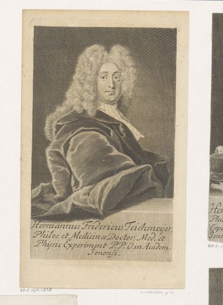 Curator: Martin Bernigeroth created this portrait of Louis Alexandre de Bourbon, Count of Toulouse, around 1704. It's an engraving on metal and is currently housed here at the Rijksmuseum. Editor: My first thought? Powdered wigs, baby! It’s like looking into a very elaborate cloud. Gives the whole image a sense of theatrical drama, doesn't it? Curator: Indeed. Bernigeroth's portrait captures the height of Baroque portraiture, where image was power. Louis Alexandre, legitimized son of Louis XIV, is carefully positioned within systems of royal representation and militaristic valor. The meticulous detail of the engraving, rendered on metal, contributes to the overall sense of opulence and controlled status. Editor: You said it! But even beyond that political symbolism, isn't there a kind of inherent fragility? The metal engraving—this permanent, seemingly strong medium—rendering such ephemeral fashion, these fleeting symbols of status. And there is something comical to it. Curator: I appreciate that reading. It underlines how the work exists in an interesting tension between capturing power, masculinity, and the material limitations of artistic representation. Think of the legacy of Bourbon absolutism, or what it meant for a “natural” child to climb through court. His dark skin also has an impact on the history of the work. Editor: You're right, and that wig is HUGE. But beyond that, the dark background lends so much importance to the armor itself! Look how Bernigeroth has contrasted it to the swirling backdrop; that metal becomes like liquid mercury. You just can’t peel your eyes away. Curator: A wonderful observation, emphasizing how material choices influence the symbolic potency of this piece. Editor: Exactly! Anyway, I feel like I need a history book... and maybe a giant wig. Curator: And perhaps a more critical view of absolutism? Editor: Fair enough. See you at the next portrait.