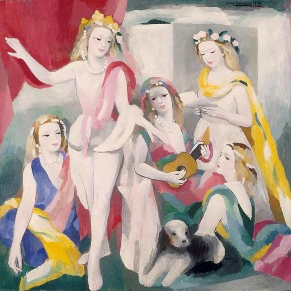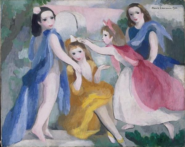 Curator: Before us is Marie Laurencin’s "Балерины на отдыхе" - or, "Ballerinas at Rest". Editor: My initial impression is ethereal, like a dream sequence with its pastel tones. The figures almost seem to blend into the background, and the composition feels very light and airy. Curator: Yes, that delicate atmosphere is key. It's vital to consider the materials to understand her artistic practice. The painting features what looks to be a blend of acrylic paint, oil pastel, and possibly oil paints. The layered texture suggests careful, deliberate choices of medium that play with light and opacity, typical of many painters of her era given the means to refine their chosen method. How do you interpret that from a structural point? Editor: Structurally, that translucence emphasizes a sense of surface tension. See how she’s balanced the figures and objects, creating an interplay of linear forms with those hazy edges. The cool blues and greens further heighten the composition's ephemeral feel. Curator: The materiality further points to the painting's relationship to societal conceptions of beauty. By rendering her figures with delicate color, it offers a certain fantasy that catered to the upper classes in the early twentieth century and perhaps it's still catering to fantasies today. She actively engaged with representations of femininity and art consumption during that time, no? Editor: Undeniably. Through those painterly applications of color and semi-transparent form, Laurencin almost suggests a veiled or intangible reality, amplifying the figures' dreamlike quality and reinforcing themes around artifice, masking, and female identity. Curator: A telling intersection, isn’t it? Where method becomes almost as much a medium as the painting itself. Editor: Precisely, Marie Laurencin challenges viewers to consider how inherent formal structures create or amplify specific meanings and elicit particular emotional reactions. Her aesthetic gives life to that effect. Curator: I will agree with that; those layers of paint and context truly transform our perception and provide deeper consideration to artistic and societal influences when faced with her work. Editor: Yes. And understanding it allows us to fully see its artistic choices and conceptual possibilities.