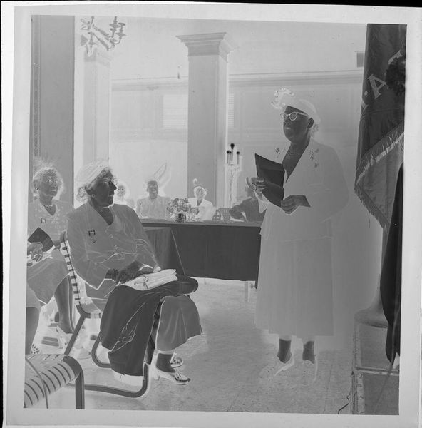 This small gelatin silver print by Robert Burian captures a man and woman at a party. The work presents us with a curious inversion, characteristic of photographic negatives. It's challenging to pin down the exact social context without more information on the artist or the event. However, the checkerboard floor and the folding chairs suggest a mid-century, possibly institutional setting. The man's attire – a white gown-like garment – and the other man's tuxedo, raise questions about social roles and performance. Is it a costume party? A formal event with unconventional dress codes? To truly understand this image, we'd need to delve into the cultural history of dress, social gatherings, and photography itself. Historical archives, fashion studies, and even oral histories could shed light on this intriguing moment. Ultimately, the meaning of this photograph lies in the intersection of social practices and visual representation, reminding us that art is always embedded in a specific time and place.