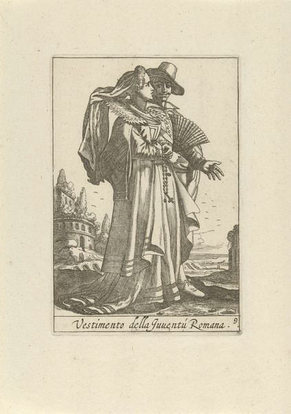 This engraving of a couple dressed in Milanese fashion was made by an anonymous artist. Representations of fashion served an important function at a time when travel was uncommon, but trade in luxury goods was expanding. Milan, in particular, was well known for its production of armor as we can see here, with the male figure sporting a breastplate and sword. He also wears a feathered hat, underscoring the importance of spectacle, display, and status. The woman's dress, with its elaborate patterning, and the very fact of their being a couple signals a certain social class. Engravings like these played a crucial role in the culture of consumption, allowing people to envision themselves as part of a cosmopolitan world. It also demonstrates the emergence of fashion as a marker of regional and national identity. Further research into costume books, trade networks, and sumptuary laws would help us to better understand the social context of this image.