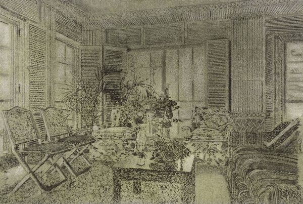 Editor: This is "Interior of Suviranta," an undated etching by Eero Järnefelt. The drawing shows what appears to be an intimate indoor scene with a few pieces of furniture and some plants. It gives me a sense of stillness. What can you tell me about this artwork? Curator: The formal qualities are quite compelling. Notice the intricate linework, the artist's choice of medium. Pen and etching lend themselves well to detailed observation, allowing for careful delineation of form. How would you describe the composition? Editor: I’d say the composition relies heavily on implied lines. My eyes dart all over the drawing. It feels rather chaotic because there is no defined focal point. Curator: Precisely. The interplay of light and shadow is also key. The artist used shading techniques to suggest form. See how the light gently contours the chair and suggests volume? Editor: I do see the areas with a more concentrated network of lines, particularly the plants and furniture at the center of the composition. This layering creates shadow and also a texture of a certain kind, right? Curator: Indeed. What semiotic interpretations might we glean from the recurrent motifs, the interior space perhaps serving as a mirror reflecting internal contemplation? Editor: So, rather than seeing it as a simple room, it's an exercise in capturing stillness and reflection of inner peace through detailed linework and attention to shadows? Curator: Exactly. It offers an alternative method to achieve tranquility: the method of embracing disarray. Editor: That’s fascinating! I appreciate how understanding the materials and the use of composition brings forward a more contemplative message.