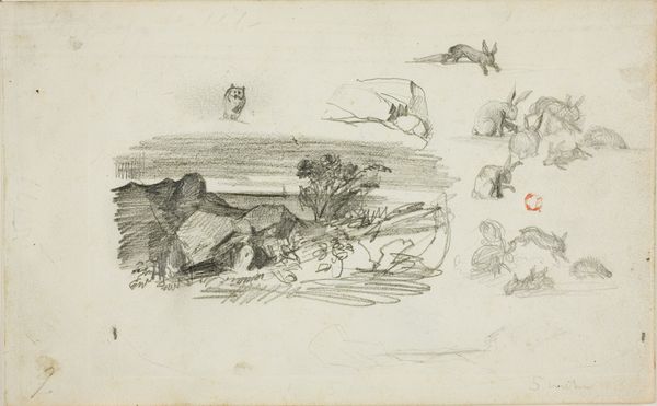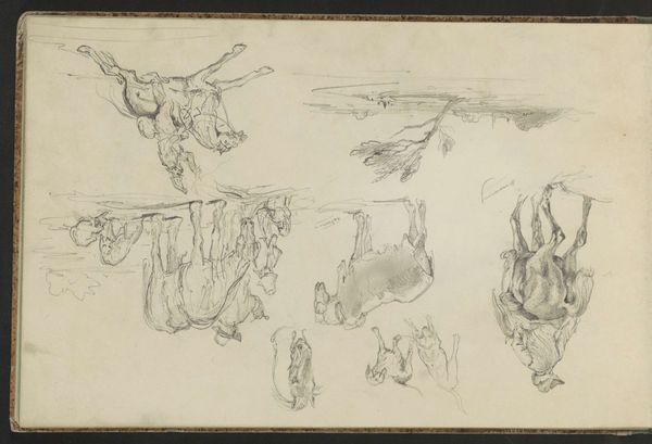 Editor: So, this is "Studies of Crowing Rooster and Reclining Figures" by John Flaxman, made in the late 18th or early 19th century, with pencil on paper. It reminds me of a page torn from a sketchbook – loose and informal. What strikes you most about this page? Curator: What stands out for me is the combination of classical figuration with the quotidian reality of a farm animal. Flaxman, of course, was deeply engaged with neoclassicism, drawing inspiration from antiquity, but sketchbooks often served a different function. I'm wondering how the rising merchant classes influenced the creation and circulation of works like this. How do you think this combination reflects the artistic climate of the time? Editor: That's an interesting perspective. It's like the rooster is crashing a very serious, neoclassical party. But what party is it and where were pieces like this exhibited, if anywhere? Curator: Well, I don't think it was intended for public consumption in its current state. Sketchbooks were intensely personal spaces, sites of experimentation. Flaxman probably never intended it to be shown publicly in his lifetime. The rising middle class enjoyed greater access to art, but this, in particular, may have served more as a document of ideas for a more polished artwork commissioned later. How might viewing this piece as preparatory rather than final alter our understanding? Editor: Hmm, seeing it as a stepping stone, it demystifies the art-making process. He’s just figuring things out. Maybe this wasn't high-brow culture yet, but practice. The museum holding it up as something culturally relevant now grants the piece value. Curator: Precisely. The value assigned, and by whom, drastically changes meaning across centuries. And considering that changes our understanding of the museum's role as a place of constructing that cultural and financial value. Editor: That’s made me think a lot about where artistic value actually originates. Curator: Indeed! It’s a complex interplay of artist intention, cultural context, and the institutions that present and preserve art for public consumption.