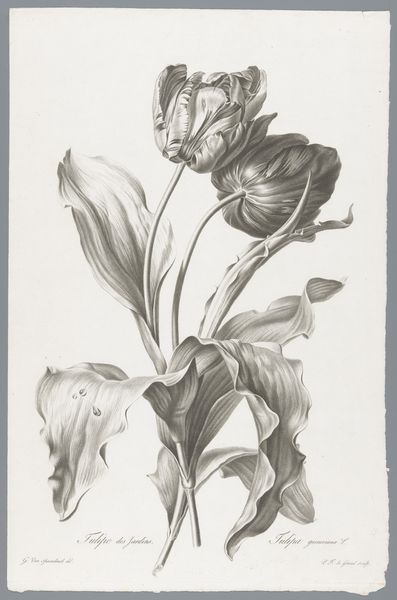 Pierre François Legrand created this print of a rose, likely in the late 18th or early 19th century. Botanical illustration flourished in this period, reflecting both scientific curiosity and the aesthetic sensibilities of the Enlightenment. The image itself speaks to a culture deeply interested in classifying and understanding the natural world. Consider the level of detail, the almost clinical way the rose is presented. This wasn't just about creating something beautiful; it was about documenting and categorizing, mirroring the scientific ambitions of the time. These kinds of images were often commissioned by wealthy patrons or scientific institutions, reflecting the social and economic structures that supported such endeavors. To truly understand this print, we'd need to delve into the history of botany, the economics of printmaking, and the social networks that connected artists, scientists, and patrons. The meaning of this image isn't just in the rose itself, but in the world that created and consumed it.