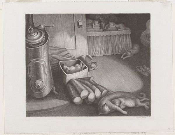 Curator: We're looking at a print titled "Still Life" by Demetrius-Emmanuel Galanis. The piece seems to be crafted from graphite or pencil, maybe a combination of dry media. Editor: It’s evocative. There's a solemn stillness here, almost monastic. The restricted palette enhances a feeling of quiet contemplation. The contrast, the shadows... they weigh on the objects. Curator: It’s interesting that you mention the objects; this arrangement features traditional still-life components. We see a jug, what appears to be a simple plate with fruit, and a glass, all arranged carefully on a surface draped with fabric. Consider how the historical conventions of still life have often reflected societal values around domesticity and consumption. Editor: And yet, there’s a rejection of overt opulence, isn't there? It's deliberately muted. The monochrome removes any possibility of seductive colours that traditionally signified wealth and privilege. It reminds me how still lifes can symbolize vanitas, the transience of earthly existence. Does this play on contemporary concepts of excess? Curator: Absolutely. Think about how the genre itself, initially celebrating the possessions of the wealthy, underwent a shift. We begin to question the very idea of material possessions. This printmaking tradition made art more democratic and accessible. Could we argue that printmaking, at that time, defied some forms of elitism in art and knowledge? Editor: Certainly. And note the focus on texture. The cross-hatching captures the soft fabric, but it simultaneously brings it almost to the same material quality as the ceramic jug, blurring the expected tactile relationships. It democratizes the hierarchy of things portrayed! Curator: Indeed. We could also explore how this piece positions itself within printmaking history and its reception. Think about how prints like this were collected, circulated, and valued, in contrast to unique artworks. Editor: Looking at this composition from a contemporary view, I see how the artist engaged not just with realism, but imbued the still life with socio-political layers about production and distribution of an image. Thank you for guiding my gaze. Curator: My pleasure. Analyzing this, we’ve seen the artist created more than a collection of inanimate objects, we find they opened dialogues about the social framework.