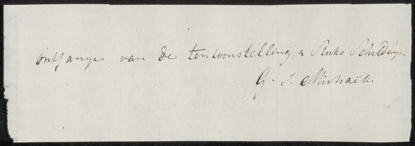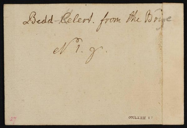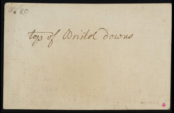 Curator: This diminutive piece, "[inscriptions not by Turner]" by Philip James De Loutherbourg, presents an intriguing mystery. Editor: It’s incredibly minimal. Almost austere. The texture of the paper itself becomes the dominant feature. Curator: Indeed. De Loutherbourg was known for his elaborate stage designs. This seemingly blank support, located in Tate Collections, challenges our understanding of his oeuvre. The writing on the paper, however, suggests an origin point: “View from Nant Ffrancon”. Editor: The raw quality of the material and those handwritten notes suggest an intimacy, almost like a discarded thought made material. Was this a preparatory sketch, a rejected idea? Curator: Perhaps. This small-scale work offers a glimpse into the artistic process. It prompts us to consider the unseen labor and decisions that shape grander artistic creations. Editor: Absolutely. It’s a reminder that even the simplest of materials can carry immense conceptual weight.