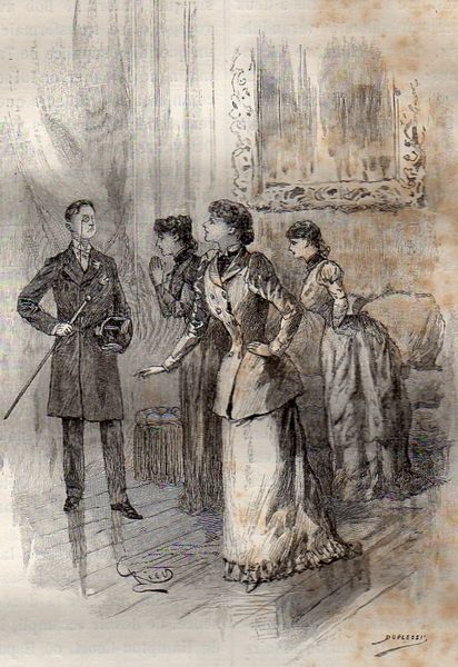 Edouard Riou created this illustration, "Story Le Rubis Du Grand-lama," using detailed line work to articulate form and texture. The composition is anchored by two figures in the foreground, their interaction framed by an arrangement of seated individuals in the background, under a framed artwork. Riou’s attention to line and form invites us to consider the underlying structure of social interactions represented here. The density of lines creates texture, emphasizing the materiality of clothing and furnishings, which speaks to the semiotic codes of wealth and status within a society. The drawing employs a subtle use of perspective to structure our gaze. Ultimately, it’s the interplay between these aesthetic elements and the illustration’s subject matter that leads us to decipher its multiple layers of cultural meanings. The way Riou constructs this scene is a fascinating exploration of how art intersects with broader cultural and philosophical themes.