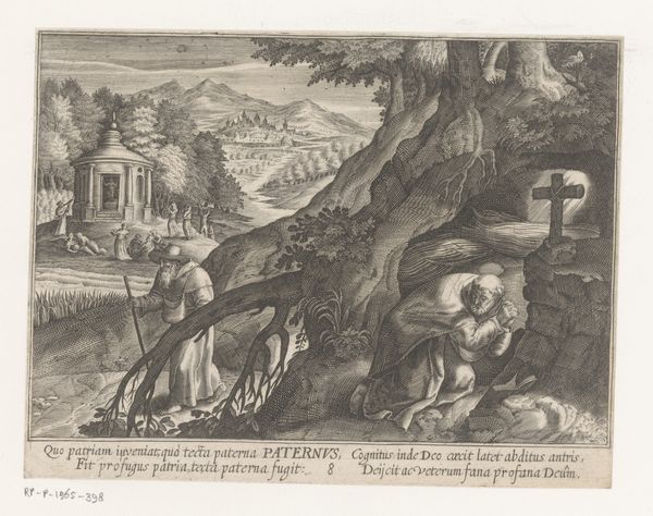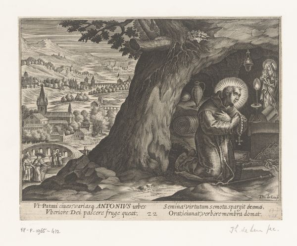 Charles van Boeckel's engraving presents Epiphanius as a Hermit, framed within a meticulously structured composition. The scene unfolds around a central figure seated beneath a tree, balanced by the contrasting landscape elements to the left. The texture, achieved through fine lines, creates a rich visual density, evoking a somber, contemplative mood. The engraving employs a deliberate contrast between the detailed foreground and the receding landscape to explore the concept of retreat from the world. The figure's placement on a rugged terrain, juxtaposed with a distant town, suggests a symbolic detachment from societal life. This is emphasized by the presence of an attendant monk, a mediating figure between isolation and community. The structural interplay between the natural and constructed environments reflects the tension between spiritual seeking and worldly existence. The formal choices in this engraving, particularly the use of line and spatial arrangement, invite us to consider broader philosophical questions about the individual's place in the world. It serves as a visual meditation on solitude, faith, and the search for meaning.