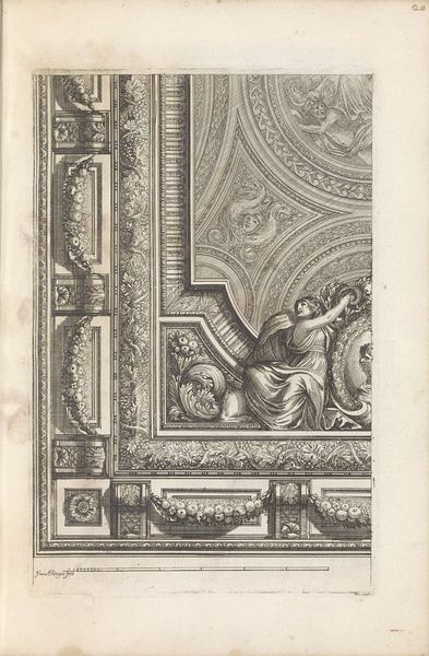 Editor: So, this is "Kwart plafond met twee mannen leunend over een balustrade," after 1644, by Franz Ertinger, held at the Rijksmuseum. It's an engraving of a ceiling design. The level of detail is incredible. What jumps out to you when you look at this piece? Curator: What immediately strikes me is how this engraving embodies the ambitions of Baroque art. It’s not simply decorative; it reflects power, wealth, and sophisticated taste. These ceiling designs were essentially propaganda. Editor: Propaganda? How so? Curator: Think about where these ceilings were installed. Palaces, churches, grand residences. They visually communicated the owner's status and their connection to cultural and religious narratives. The elaborate carving and figuration… It’s about impressing visitors, isn't it? Making a statement. Editor: I guess I hadn’t considered the setting like that. It's so easy to get lost in the ornamentation. What about the classical figures? What role do they play? Curator: Absolutely! The figures – gods, putti, heroes – are deliberately chosen. They reinforce a sense of lineage and authority. These patrons sought to associate themselves with the glory of the past to legitimize their position in the present. Did they actually live up to those implied standards? That's a question the piece seems to beg. Editor: So it's about visually constructing an identity, then, and controlling the message that was being sent to visitors. Curator: Exactly! Art was a tool, and these engravings helped disseminate these ideas on a wider scale beyond those who actually had a frescoed ceiling. They are like architectural aspirations! Editor: That’s a really different way of thinking about decorative art. It makes me see the artwork, and Baroque art in general, as less about ornamentation and more about social dynamics. Curator: And hopefully appreciate the subtle and not-so-subtle ways that art continues to shape our understanding of power.