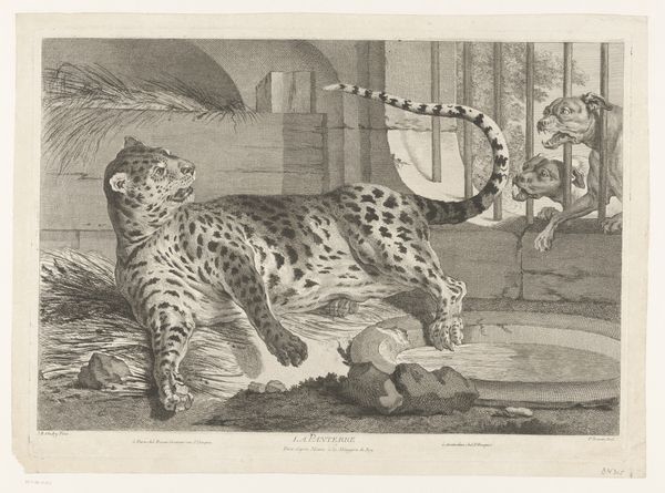 Editor: This is Marcus de Bye’s "Liggende leopard, vendt mod venstre," dating from around 1638 to 1690. It's an etching, and what strikes me is its tranquility; despite being a predator, the leopard appears so relaxed, almost domestic. How do you interpret this work? Curator: The image of a leopard, then as now, carries considerable symbolic weight. Here, rendered through the detailed lines of etching, it's interesting to consider the cultural context of the Dutch Golden Age. What did this animal represent to viewers of that era, removed from the animal's natural habitat? Editor: Possibly exoticism? A display of knowledge about the wider world? Curator: Exactly. But also, consider the potential for conflicting interpretations. The leopard might symbolize power and strength, but in this state of repose, might it also represent controlled or even domesticated power, brought under human dominion through artistic representation? Does the landscape it occupies enhance that symbolism? Editor: That’s a really interesting point. The background is minimal, almost barren, highlighting the leopard’s stillness even further. Curator: The spots, too, can be seen as symbols themselves. The ordered pattern is a visually pleasing signifier of the untamed world. Think about how different cultures have historically understood and visually represented powerful animals; this etching contributes to a long history of using animal imagery to explore themes of nature, culture, and power. Editor: So, what I initially saw as simply a peaceful scene contains deeper layers about how humans perceive and portray their relationship with nature. Fascinating. Curator: Precisely. The image of the leopard becomes a potent vehicle for exploring our own cultural values and anxieties regarding the natural world.