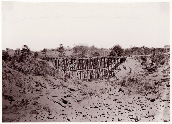 Andrew Joseph Russell captured this photograph, "Dutch Gap Canal," using the wet collodion process. The albumen silver print offers a study in contrasts and textures, immediately drawing the eye to the geometric precision of the wooden bridge. Its rigid horizontals and verticals stand out against the organic forms of the surrounding landscape. The photograph invites a semiotic reading, where the bridge becomes a signifier of human intervention and control over nature. This is sharply juxtaposed with the canal and surrounding foliage that represent the raw, untamed aspects of the natural world. This tension destabilizes any straightforward reading of progress, suggesting a more nuanced engagement between industrial advancement and ecological presence. Notice how the bridge's structural elements form a grid, imposing order onto the scene, while the reflections in the water below create a distorted, almost dreamlike echo of this order. Through Russell's strategic composition, "Dutch Gap Canal" functions beyond mere documentation, evolving into a complex meditation on space, power, and representation.