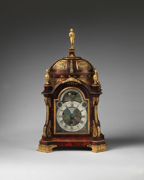 Curator: At the Metropolitan Museum of Art, we have an exquisite example of an English bracket clock dating to 1755. Made from wood, it's a striking piece of decorative art that encapsulates the Baroque style. Editor: My immediate impression is that it looks like a miniature Gothic cathedral dedicated to timekeeping! The intricate carvings lend it a gravity that feels both archaic and slightly whimsical. Curator: Precisely. These bracket clocks became symbols of wealth and status in the homes of the affluent. Placing a timepiece like this on a table or shelf allowed individuals to manage their day more strictly, marking a shift towards regimented routines, driven by societal factors of trade, manufacturing, and new work ethics. Editor: That's fascinating. Beyond the time-telling function, there is a density of imagery that feels almost ritualistic. The repetitive Gothic arches suggest more than mere decoration, perhaps reflecting anxieties about order or control during an era of intense change. Also, do you see how dark the wood is, how it absorbs the light? Time here is weighty, something to be measured, and potentially feared. Curator: Indeed. The darkness and weight were very much by design. Such items often functioned as focal points in a room, indicating that the household was cultured and up-to-date. The meticulous craftsmanship speaks of an owner obsessed with time, precision, and quality, thereby elevating their social standing. Editor: Thinking of how the light might catch those carvings throughout the day, imagine the shadow play! This wasn’t just about telling time. It’s about time as performance, time as a demonstration of power. Curator: I concur. And while we admire this marvelous example of decorative arts, let's reflect on how material possessions like these shaped, and continue to shape, our perceptions of time, value, and status. Editor: Absolutely. The symbolic richness layered onto such practical objects offers endless insight into how we build cultural meaning and encode psychological attitudes.