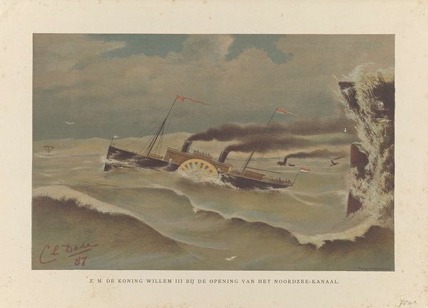 Editor: This mixed-media piece, "The Rescue," created sometime between 1875 and 1900 by Thomas Stevens, really captures a dramatic scene at sea. I'm struck by the way the textile elements blend with the watercolor and coloured pencil, creating a sort of naive but intense representation of danger and heroism. What do you see in this work? Curator: I see a fascinating convergence of textile production, artistry, and social commentary embedded within this small landscape. Let's consider the cultural context: late 19th century England. The production of woven silk 'pictures' was booming. But beyond decorative appeal, pieces like "The Rescue" engage with narratives of Victorian heroism and anxieties surrounding maritime disasters. How do you think the medium itself—a woven textile—contributes to our understanding of the artwork's message? Editor: That's interesting! I hadn't thought about the medium itself speaking to the message. I suppose the act of weaving, with its connotations of labor and industry, almost elevates the working-class heroes in the rescue boat, doesn’t it? Is the storm in the background supposed to look real, and does that help the viewer's emotional response? Curator: Precisely. The “naive art” style might even subtly challenge academic painting traditions while still tapping into the popular taste for sentimental, narrative art. Think about whose stories were being told, and by whom, in that era. These kinds of works helped define ideas about courage and duty across class lines. Editor: I never would have considered the layers of social meaning embedded in a woven picture! It highlights how even seemingly simple artworks can reflect complex cultural values. Curator: Indeed. By viewing it as a social object, rather than simply an aesthetic one, we open ourselves to richer interpretations.