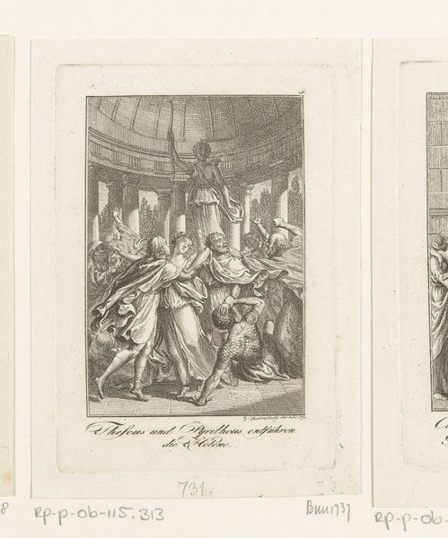 Editor: Here we have "Feind ontmoet een oude vriend," or "The Enemy Meets an Old Friend," an etching by Daniel Nikolaus Chodowiecki from 1776. It's a small print, with finely rendered lines detailing an interior scene. What strikes me most is how it looks like it could be a still from a play - very theatrical. How do you interpret the staging of this encounter? Curator: It’s interesting that you perceive theatricality because Chodowiecki was a master of capturing human interaction with great symbolic density, staging complex dramas within these small prints. Look at the man clutching his face—a visceral expression of shock or shame. What kind of narrative and cultural codes is Chodowiecki encoding? Editor: Well, there are two gentlemen meeting in what seems to be an official or public place; people are around. One man appears distressed, even recoiling, while the other has an arm extended in what might be welcome. I don't know how to tie it all together. Curator: The architecture looms in the background: Gothic arches suggest a sacred space. Consider then, how Chodowiecki situates his players amidst the old cultural forces that still dominated European life. Notice the almost caricatured facial expressions too; they hint at older physiognomic traditions that tied inner character to outer appearance. Do you think those stereotypes resonate today? Editor: Absolutely, though they can be dangerous. It’s a good reminder of how deeply ingrained those ways of seeing remain, especially given the setting. I suppose I see more conflict now and social critique than mere theatre. Curator: Exactly. The enduring power of visual language helps maintain cultural memory but it might also reproduce cultural fault lines. It encourages a certain level of vigilance when we examine works like these. Editor: I learned how important it is to understand not just what's depicted but what those symbols might have meant to the people of the time and to us today. Curator: Precisely! It serves to examine both cultural continuity and rupture within our shared visual narratives.