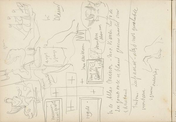 Curator: Alevtyna Kakhidze's "Untitled," created in 2022, pulls us into a world rendered with ink and pencil on paper, doesn’t it? It's one of those pieces that feels deeply personal. Editor: My first thought? Melancholy. There's a fragility in those sketched buildings, a sort of tentative existence sketched in faded sepia, almost like the buildings themselves are breathing their last. And that text scattered about… it adds a whole layer of introspective musing to it. Curator: Absolutely, I agree. I see the script in the original language that looks to be Ukrainian and English scattered across the plane, and I think that contributes to that fragile feeling and contemplative effect. I see skeletal trees next to bombed out buildings and words about nature in both languages, next to one another, which to me indicates Kakhidze grappling with themes of war, resilience and the deep, abiding connection between nature and the human spirit. Editor: Right. Language itself becomes a symbol, layering meaning. Ukrainian text evokes a specific cultural context, resilience and resistance, while the English translations attempt to make this understandable for others. There’s an intriguing echo of ancient icon painting here where text clarifies and elaborates meaning, and yet in a way that isn't entirely translatable. I'm fascinated by the image of nature having the ability to see what is happening in these structures. Do the leaves reflect or regret this imagery that they see? Curator: Beautifully put! It makes me think about how memory works—how fragments of experience, in this case, the visual language of loss alongside words of resilience, stick with us. Maybe that's why the composition feels so intentionally fragmented; the cityscape almost appears to be dissolving into the page itself. The narrative is there but it needs reconstruction. This evokes, for me at least, the way we process trauma. The artwork serves as an invitation to contemplate collective and personal experiences that have no fixed form or narrative and resist memorializing into fixed historical facts. Editor: Precisely. In iconography, ruins often signify transition, a passage between states of being. Perhaps Kakhidze is using this visual vocabulary to highlight not just the destruction, but also the potential for rebirth that lies dormant within it. Curator: Exactly. And the simple materials she uses emphasize the raw immediacy of that transition—like a fleeting thought captured before it vanishes. A work that will continue to speak as our world confronts constant, unsettling change. Editor: It reminds us that the seeds of something new are almost always germinating even amidst what seems like utter devastation. A poignant observation rendered so simply.