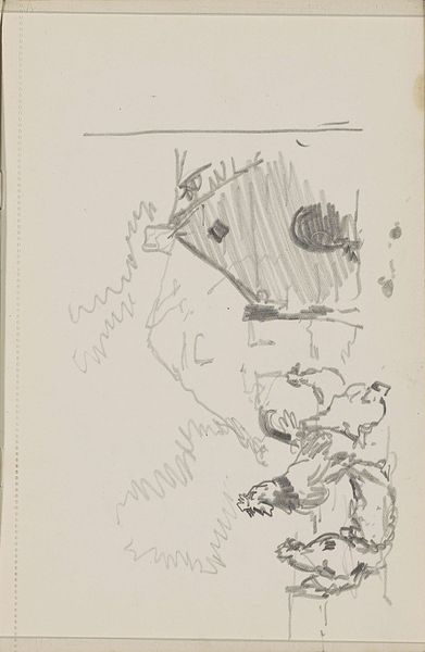 This is a pen drawing titled "Weiland met mannen die hooi maaien," by Johannes Tavenraat. The overall visual effect of the drawing lies in its energetic composition and its use of dynamic lines. The scene depicts a group of men engaged in haymaking, each rendered with swift, economical strokes. The composition itself is structured around a series of diagonal lines, which create a sense of movement and activity across the field. Note how Tavenraat’s rapid marks capture the essence of labor and rhythm. These lines do more than just define shapes, they function almost as vectors, directing the viewer’s eye and conveying the physical exertion involved in the act of haymaking. The artist's marks are open and gestural. Here, the materiality of the line underscores the transient nature of labor and the landscape. This emphasis on line and form over detail invites a reading that values the process of representation, capturing not just what is seen, but how it is experienced.