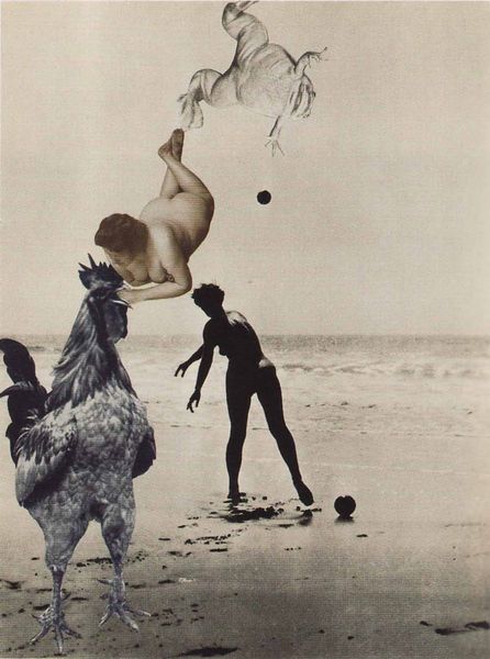 This collage, "Sans tenir compte des prévisions" (Without Regard to Forecasts) by Georges Hugnet, presents a series of playful associations between the body, the landscape, and some highly gendered assumptions. Look at how Hugnet pieces together different elements! We have this figure, seemingly female, but made up of waves, hair, and a swooshing skirt, all floating in front of an actual seascape. The contrast between these textures is very striking. It's almost like Hugnet is asking us to reconsider how we see and experience the world around us. This collage reminds me of the work of Hannah Höch, who also used collage to disrupt traditional notions of beauty. But Hugnet brings a certain lightness to the medium, a sense of humor that makes you wonder what kind of dream he's inviting us into. It’s a world where nothing is quite what it seems.