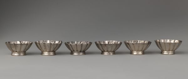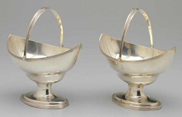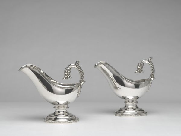 Curator: Here we have a pair of salt dishes, crafted by Peter L. Krider sometime between 1850 and 1860. Editor: The miniature size of the dishes is delightful; almost dollhouse-esque, belying their intended practical use. And the bright polish gives the silver a surprisingly modern crispness. Curator: Indeed. Note how Krider, whose workshop was based in Philadelphia, skillfully employs the interplay between void and volume in the structures. The twin handles ascend elegantly before curving back inward, accentuating the curvature of each vessel’s upper portion, all the while providing a practical function, of course. Editor: It reminds me, these twin dishes, of shared rituals—dining, conversation. Salt, a symbol of preservation and flavour, central to communal eating experiences for centuries. You see a domestic moment made elegant and symbolic, but also slightly remote given they appear solitary without the accompanying dining setting. Curator: Precisely. And it’s fascinating how the bright material quality alters our perception of this utilitarian object. Salt cellars had a definite function and practical association—here elevated by the silver. Editor: A reflection of social status, wouldn't you say? To possess tableware crafted from precious metals inherently elevates even the most commonplace ingredient to an icon of wealth. Salt has of course also served religious functions across history. It is mentioned repeatedly in both the old and new testaments. Curator: Fascinating to consider these subtle associations! These salt dishes represent a compelling investigation into both utility and surface treatment; one must acknowledge the importance of symmetry. Each is essentially the same yet exists together, completing a sense of shared aesthetic intention and mirrored production, reflective perhaps of 19th-century manufacturing ideals, which emphasized mass production along with careful surface detail. Editor: Exactly, from domestic object to statement of societal beliefs and aspirations; quite a small package containing expansive symbolic meaning! Curator: A testament to how visual inspection paired with critical thinking is essential for evaluating this diminutive artwork. Editor: Leaving me contemplating ritual, status, and that glimmer of silver – a small prompt into human culture’s constant pursuit of more.