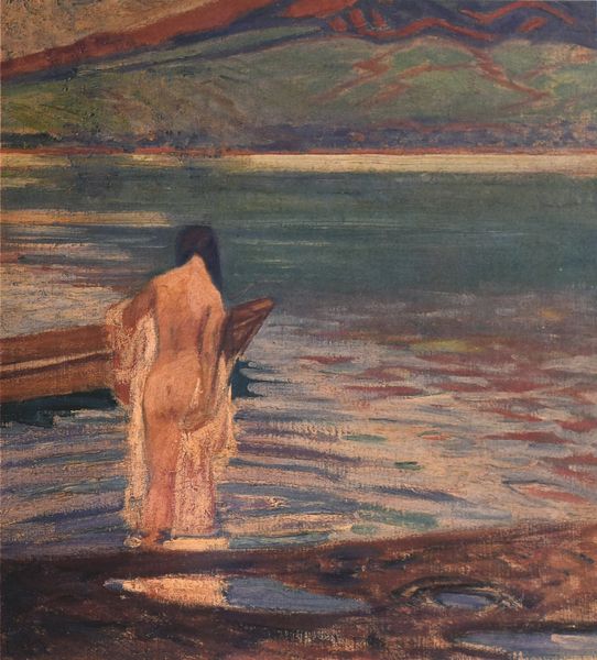 Childe Hassam made this painting, Nude on the Cliffs, with oil paint, and it feels like an exercise in different types of touch. The brushwork is visible and varied, like an exploration of paint itself. Looking closely, you see the cliff face built up with these short, dabby strokes. The colors are mixed right on the canvas, these greens, yellows, and browns, and it gives the rock a real sense of texture. Then, beside it, the water is this shimmering, almost transparent wash. There's a contrast between how the nude is rendered, with these soft, blended tones, and how the cliff is handled with that rough, almost crude, directness. Hassam is interested in the process itself. There's this feeling that painting is a conversation between the artist and the materials, and this piece really brings that to the foreground. It reminds me a bit of Cézanne, how he used paint to build form, not just describe it. You get the sense that Hassam is figuring it out as he goes.